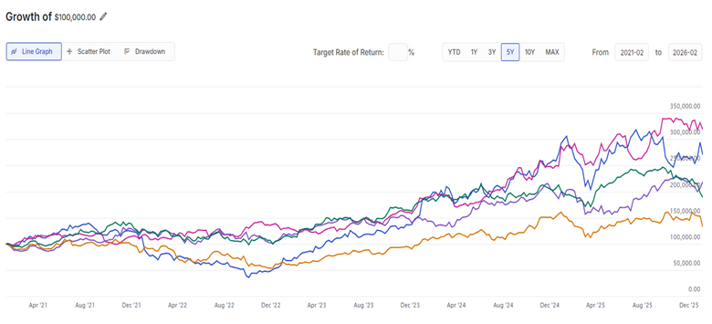 Here is a graph of five tech companies and their performance over the past five years. The question is which of these five has done the best over that period:
